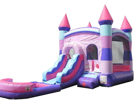 Combining the fun of a traditional bounce house and the thrill of a slide and attached pool, our Royal Pink Combo will be the perfect addition to your special event or backyard fun. This unit measures 12 L x 26' W x 14.5' H. We offer dry or wet use (for an additional charge) of this rental. If ordered dry, there is no attached pool.